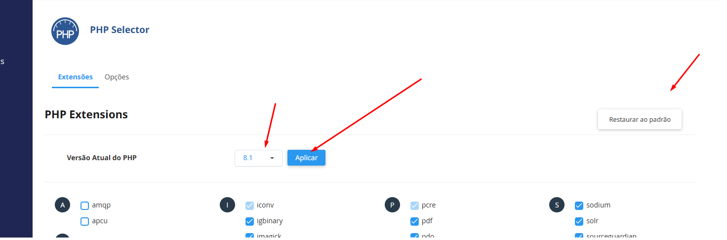 Segundo, cPanel, Extensões do PHP, escolha a versão deseja, clique em aplicar e em seguida restaurar: